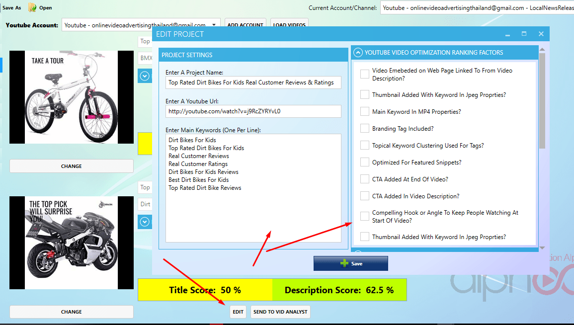 You can also edit your thumbnails here, update your titles and descriptions and see in an instant your seo scoring for your title and description and edit both as well as tags within the software.
