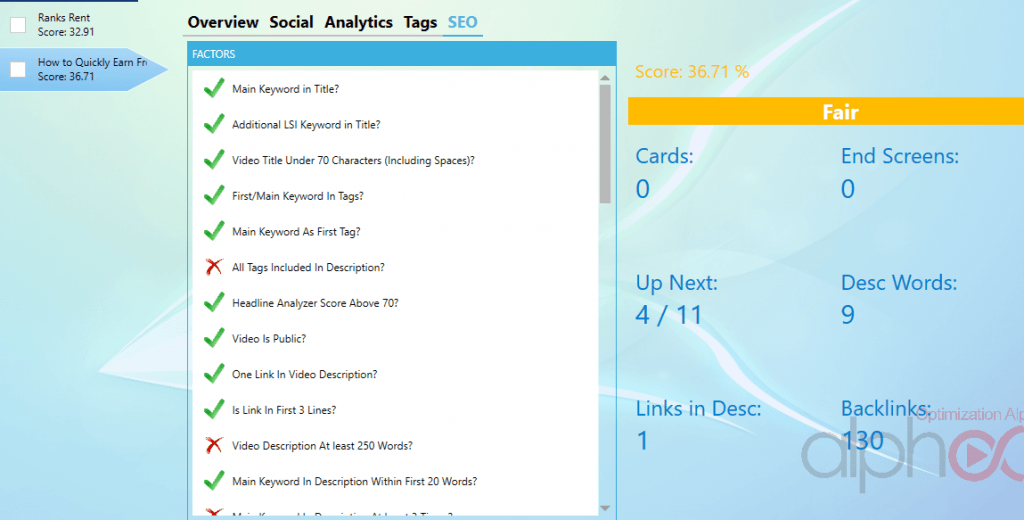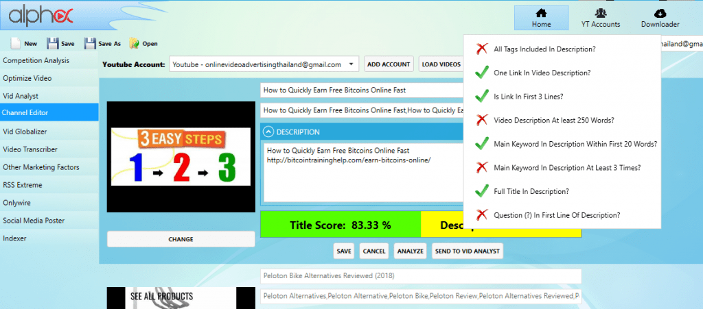 This gives you a cloud video of all your YouTube "Public" videos and their optimization scoring in a simpler format than the Vid Analyst but in a really useful way that you can see the main optimization points to fix immediately.